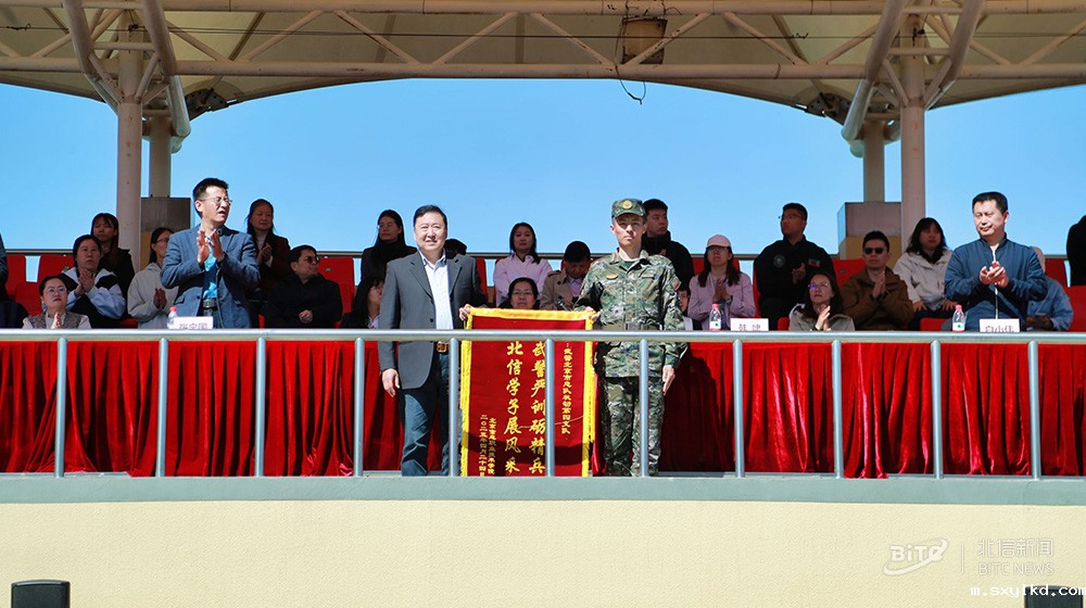 董国东代表学校领导班子致辞,向承训部队全体教官致以敬意,向辛勤保障军训任务的各部门表示感谢,向圆满完成军训任务的参训学生表示祝贺。致辞结束后,董国东代表学校向承训单位赠送锦旗。